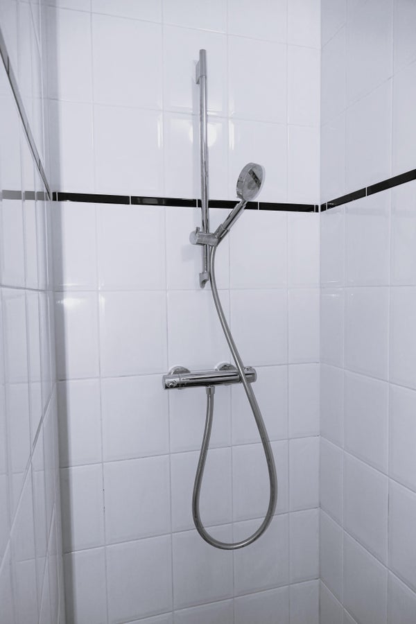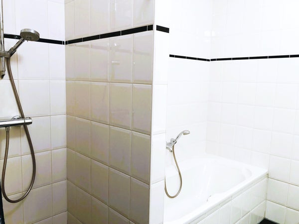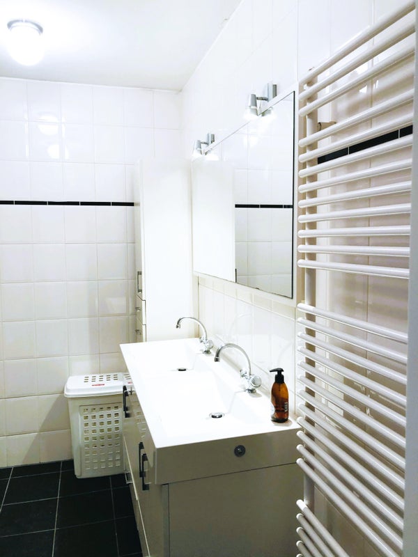 De moderne badkamer is uitgerust met een ligbad, aparte douche, dubbele wastafel en designradiator. Een aparte toilet bevindt zich een deur ernaast.