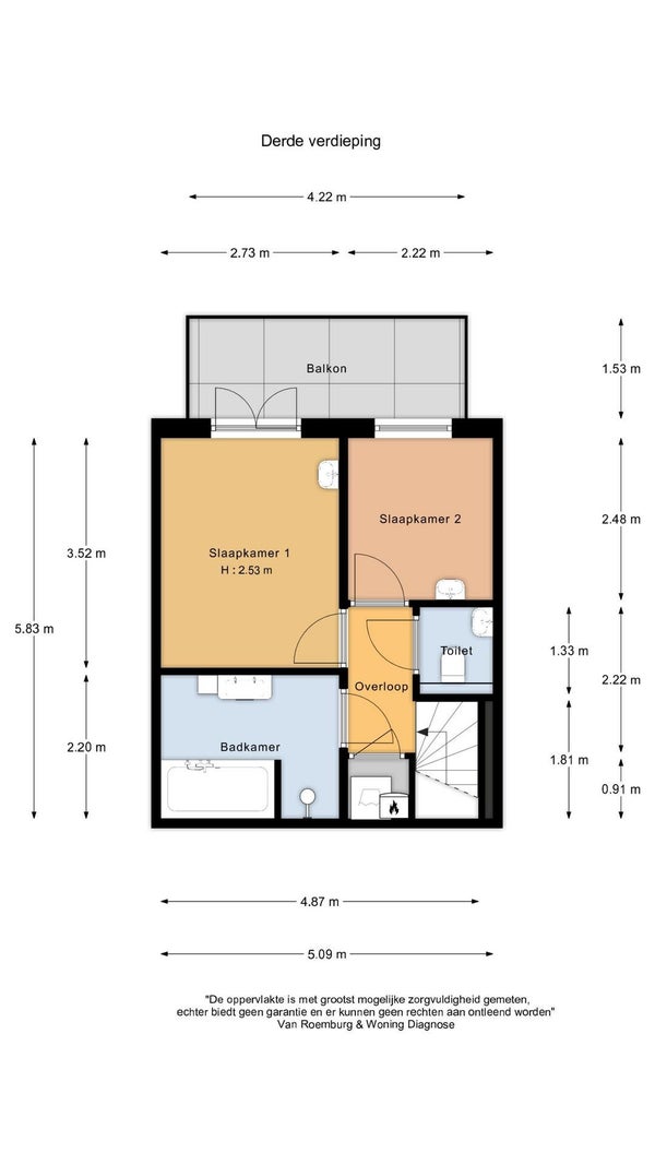 Via een vaste trap bereik je de bovenste verdieping. Hier bevinden zich de ruime hoofdslaapkamer met toegang tot een tweede balkon en een tweede (gast)kamer die ook uitstekend gebruikt kan worden als werkkamer of inloopkast.