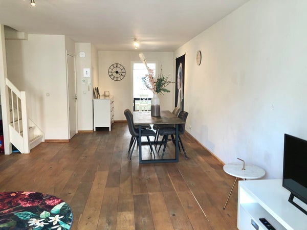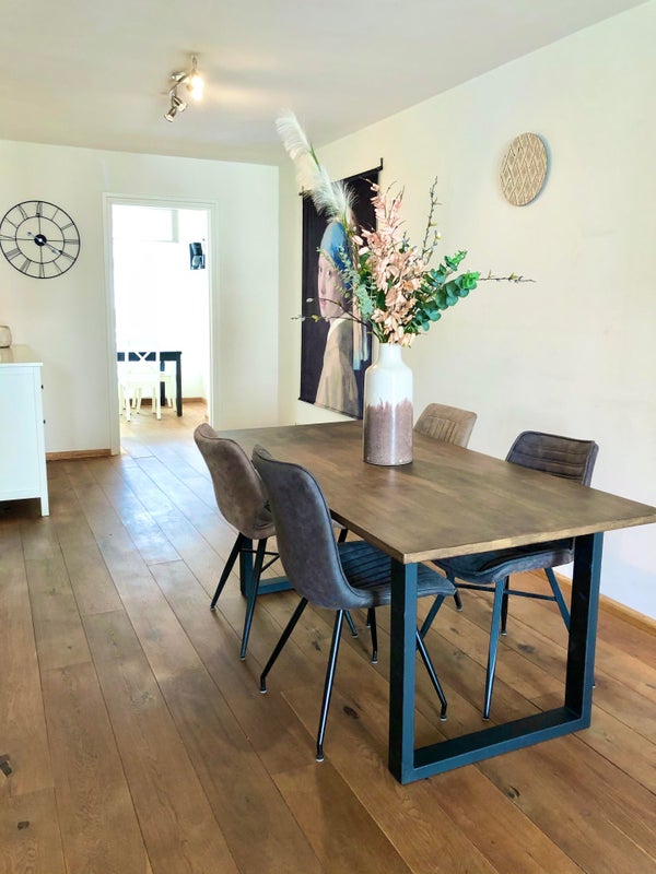 Door de hele woning ligt een fraaie houten vloer en is er veel natuurlijk lichtinval, wat zorgt voor een ruimtelijk en comfortabel gevoel.