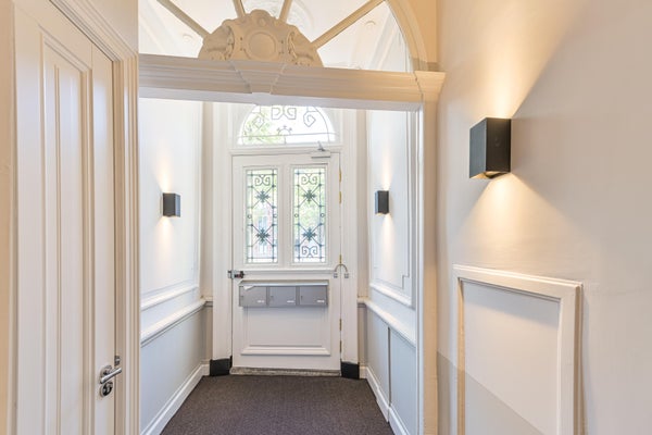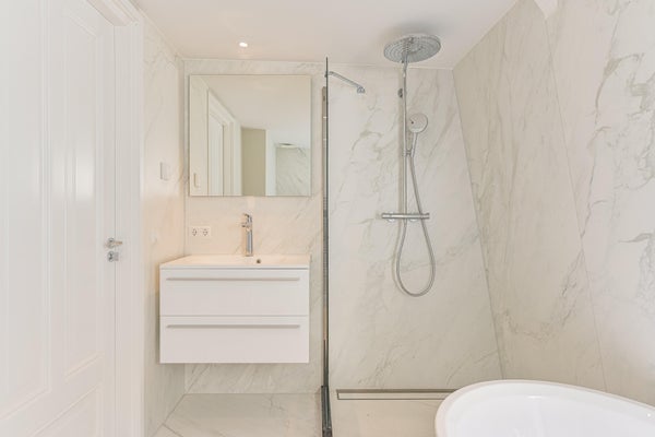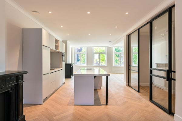 Entree via een breed en authentiek trappenhuis met monumentale details, zoals plafondornamenten en een klassieke trapleuning. Riante woonkamer aan de voorzijde met hoge plafonds en grote raampartijen. De moderne open keuken, voorzien van Siemens inbouwapparatuur, vormt het hart van de leefruimte. Aan de achterzijde bevinden zich twee ruime slaapkamers, waarvan één met directe toegang tot het balkon. De woning beschikt over twee luxe badkamers, beide uitgevoerd met sanitair van Villeroy & Boch en voorzien van onder andere een regendouche. Separaat toilet aanwezig. Het gehele appartement is voorzien van een eikenhouten visgraatvloer met vloerverwarming.