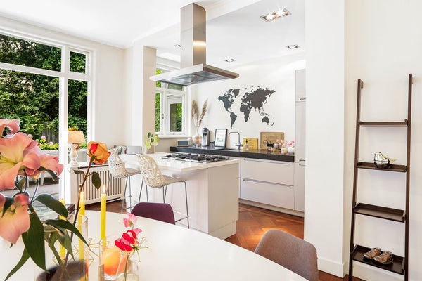 Eigen entree vanaf de straat, een prachtige hal met een apart toilet. Ruime woonkamer met aan de voorzijde een sfeervolle open haard. Luxe open keuken aan de achterzijde met kookeiland. De keuken met kookeiland is uitgerust met alle benodigde apparatuur, zoals een 5-pits gaskookplaat, combi magnetron/oven, vaatwasser, koelkast met vriezer en een aparte wijnkoelkast.