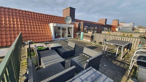 Dit volledig gemeubileerde appartement bevindt zich op de derde en vierde verdieping van het gebouw. Je komt het appartement binnen via de ingang op de derde verdieping en via een interne trap zijn de grote slaapkamer en het zonnige dakterras bereikbaar. Het dakterras is ongeveer 20m² groot en is voorzien van tuinmeubilair zoals een eettafel voor zes personen en een paar lounge stoelen.