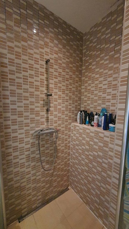 De tweede slaapkamer wordt momenteel gebruikt als extra kledingruimte; er staat momenteel GEEN BED in deze kamer. De badkamer bevindt zich in het midden van deze verdieping en is voorzien van een douche, toilet, wasmachine en wastafel. Aan de voorkant van het gebouw vind je een ruime woonkamer met een L-vormige bank en een eettafel. Er zijn drie grote ramen die uitkijken op de straat (west).