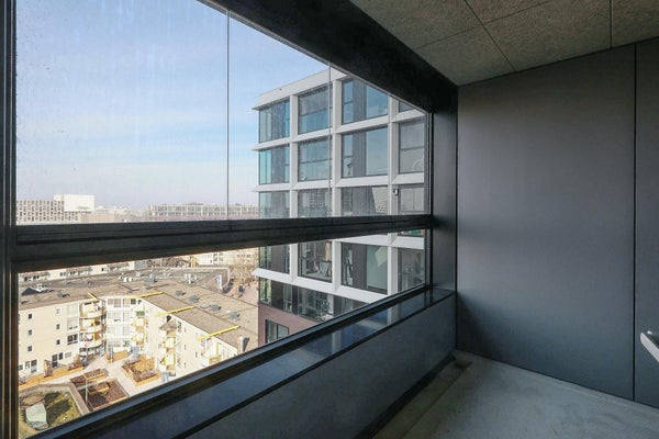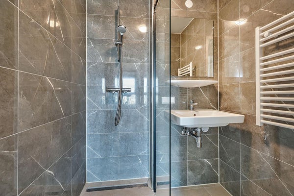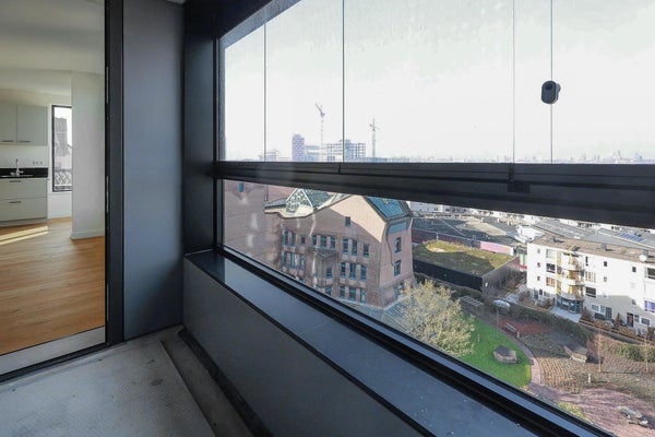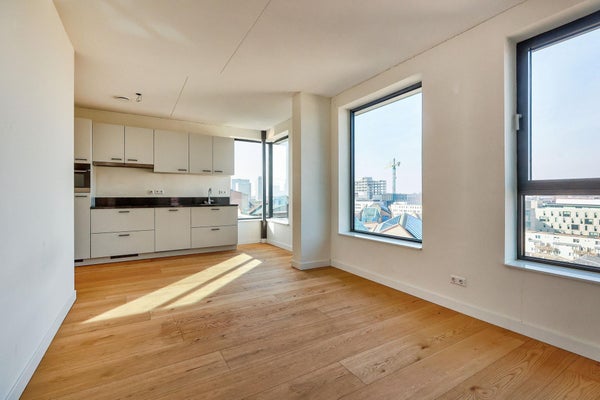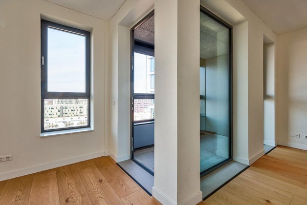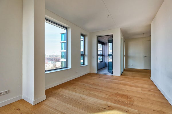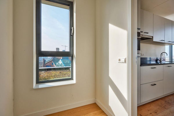 Op de 9e verdieping vindt u dit ruime appartement met een waanzinnig uitzicht. U komt binnen in de ruime hal met de meterkast, kast met stadsverwarming en de kast met het mechanische ventilatiesysteem. De hal geeft toegang tot het hangend toilet met fonteintje en de badkamer met wastafel en douche. De woonkamer heeft een open keuken. Door de vele ramen is het een licht appartement met een waanzinnig uitzicht. Via de woonkamer kom je op de loggia. De keuken is voorzien van inbouwapparatuur zoals een combimagnetron, koeler, inductiekookplaat, afzuigkap en vaatwasser. Naast de keuken heb je toegang tot een berging met de aansluiting voor een wasmachine. De ruime slaapkamer heeft ook een grote raampartij. De gehele woning is voorzien van vloerverwarming