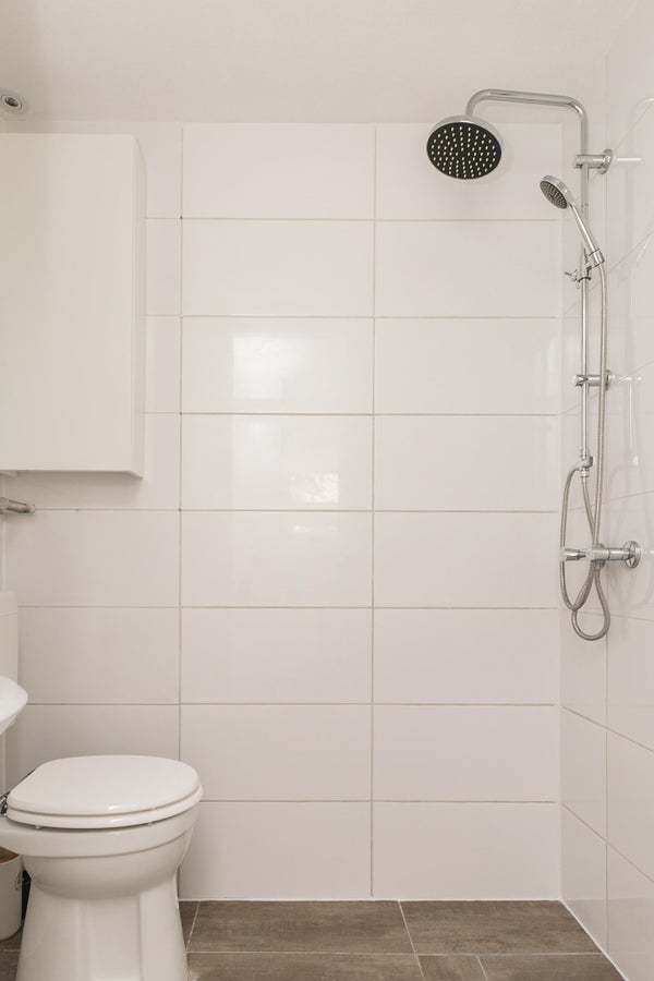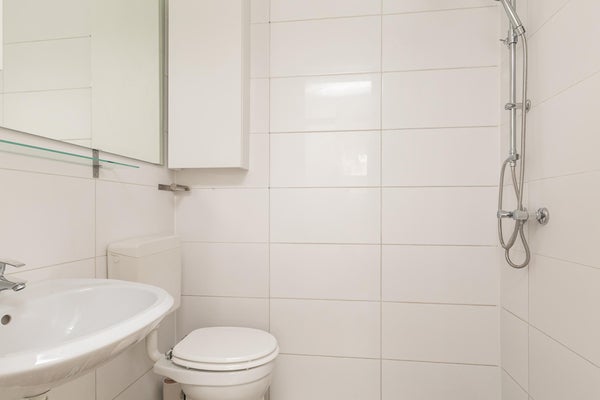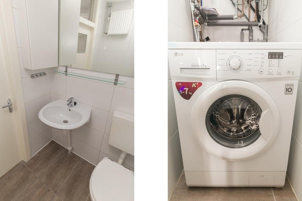 de recent gerenoveerde badkamer met een toilet, wastafel en regendouche. Verderop vind je de wasmachine en droger netje verborgen in een aparte binnenberging. Aan het einde van de gang hebben we een ruime slaapkamer met een queensize bed en voldoende ruimte voor een kast en een klein bureau. In het hele huis ligt een mooie eiken parketvloer die de luxe uitstraling van het appartement versterkt.