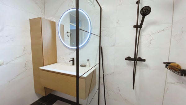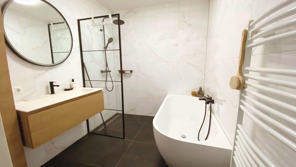 • Stijlvolle badkamer met inloopdouche en modern wastafelmeubel en ligbad