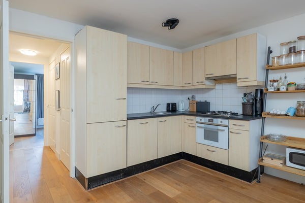 De woonkamer met open keuken is aan de voorzijde van het pand gelegen, terwijl de slaapkamers zich aan de achterzijde bevinden. De bovenste verdieping van de maisonette biedt een extra kamer en directe toegang tot het ruime dakterras.