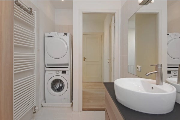 De slaapkamer ligt rustig aan de achterzijde. De badkamer beschikt over een inloopdouche, ligbad en dubbele wastafel; daarnaast is er een separaat toilet. Extra pluspunt: een praktische berging met aansluiting voor wasmachine en droger.