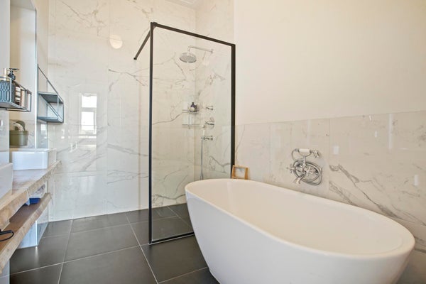 De badkamer is een heerlijke plek om te ontspannen, uitgerust met een ruim ligbad, een royale inloopdouche en een stijlvol wastafelmeubel. Daarnaast beschikt de woning over twee aparte wc’s, wat het wooncomfort aanzienlijk verhoogt.