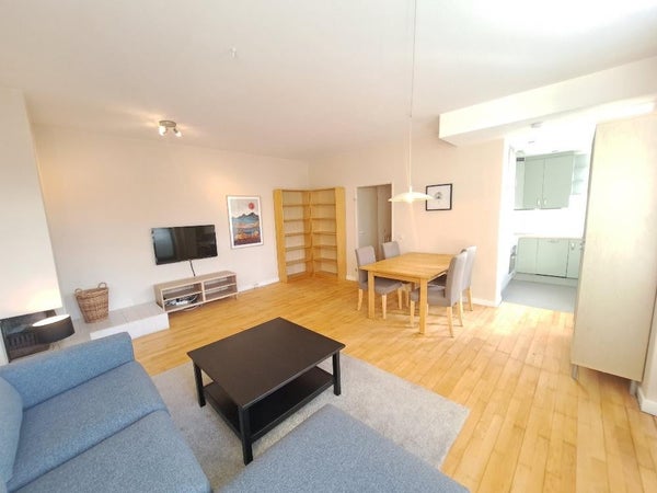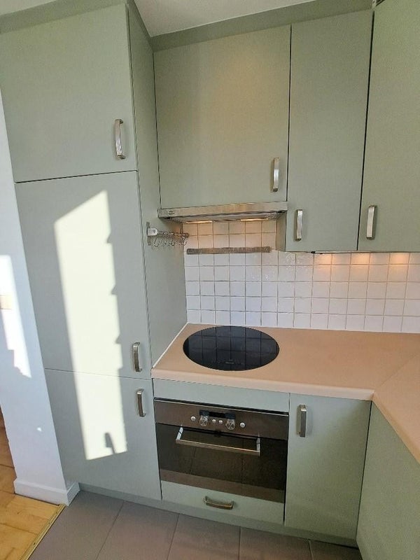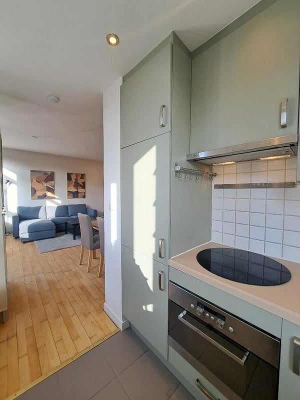 De Lichte woonkamer heeft een Mooie parketvloer en Patio deuren naar het Franse Balkon, de Open volledig geoutilleerde Olijfgroene keuken heeft een Inductie Kookplaat koelkast & vriezer, vaatwasser en een combi-oven/magnetron. vloer.