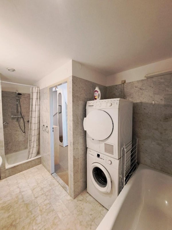 De Ruime badkamer heeft een Ligbad, een inloop-douche, een wastafel, 2e Toilet en een wasmachine en een wasdroger