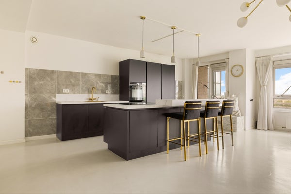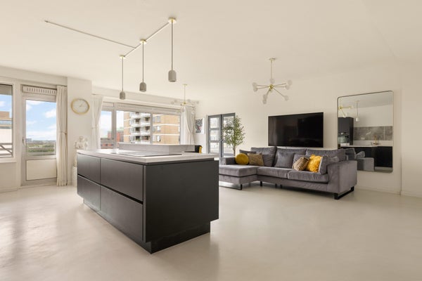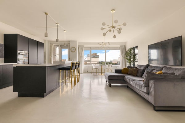 Bij binnenkomst word je verwelkomd in een licht-filled open woonruimte met directe toegang tot een groot balkon dat een open uitzicht biedt. Het grote keukeneiland met hoge barkrukken is perfect voor informele maaltijden en entertainment, en de keuken is volledig uitgerust met moderne apparaten, inclusief een inductiekookplaat, oven, koelkast van vol formaat en vaatwasser.
