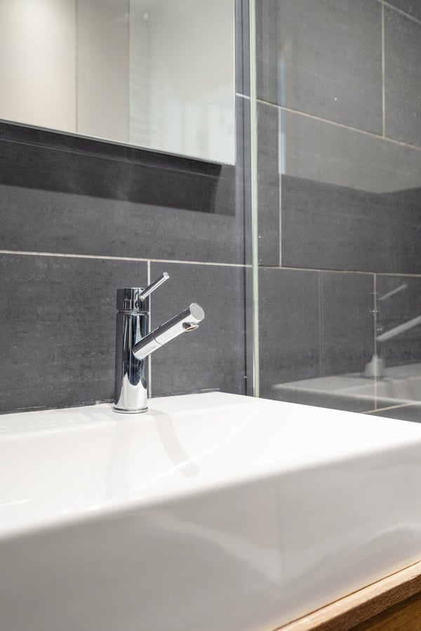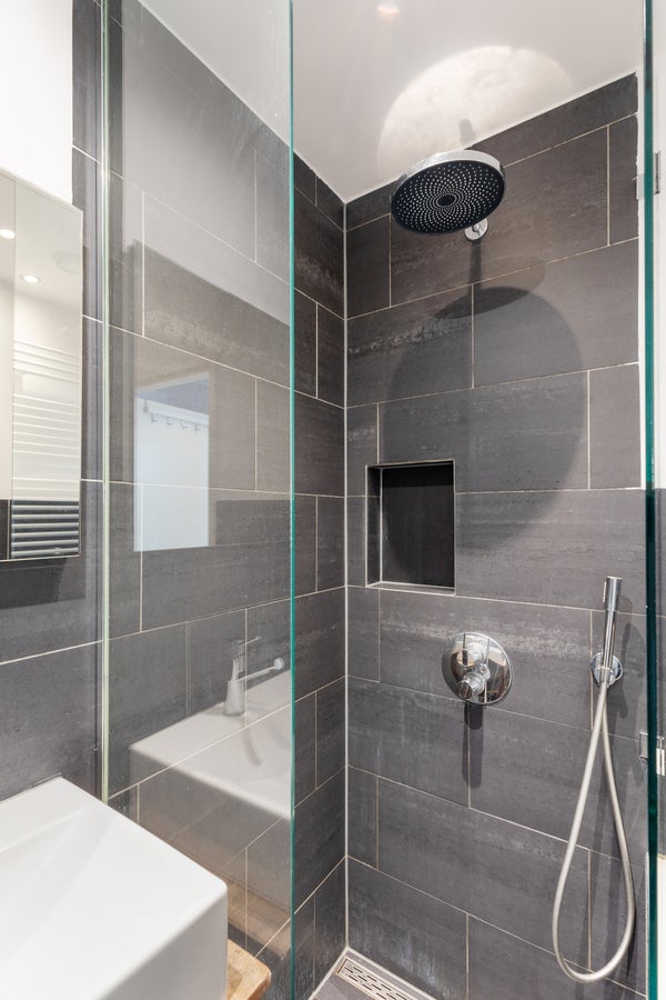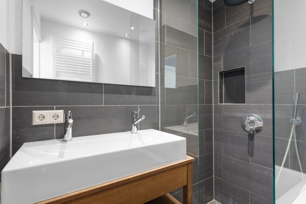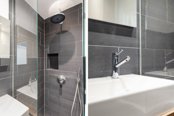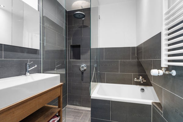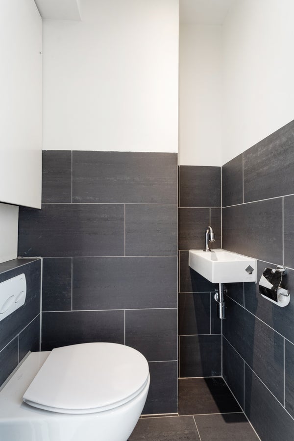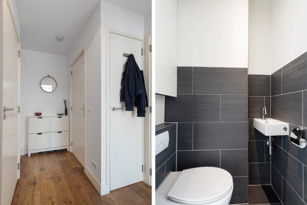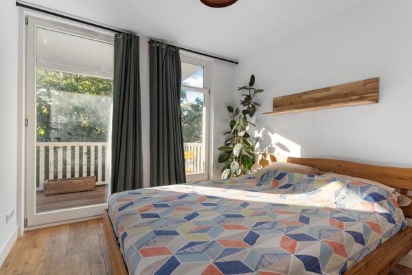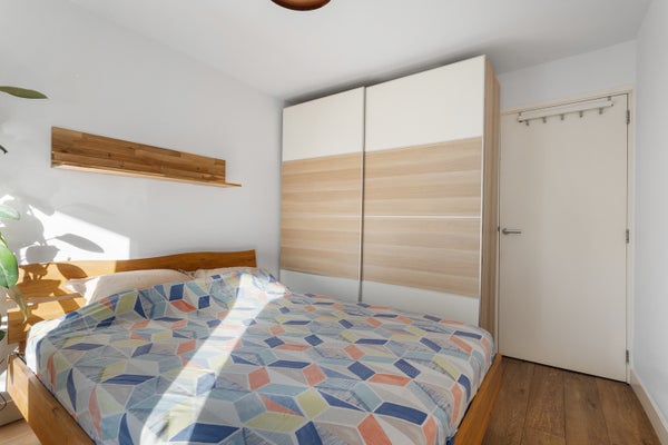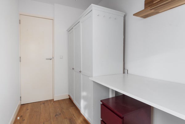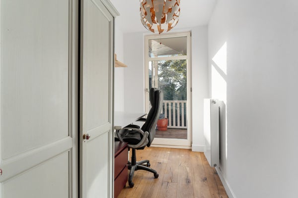 Aan de achterzijde bevindt zich de ruime slaapkamer met tweepersoonsbed en veel kastruimte. Vanuit deze kamer is het balkon toegankelijk. De tweede slaapkamer is momenteel ingericht als studeerkamer en biedt eveneens toegang tot het balkon. De nette, moderne badkamer is uitgerust met een ligbad, inloopdouche en wastafelmeubel. Via de hal bereikt u het aparte toilet.