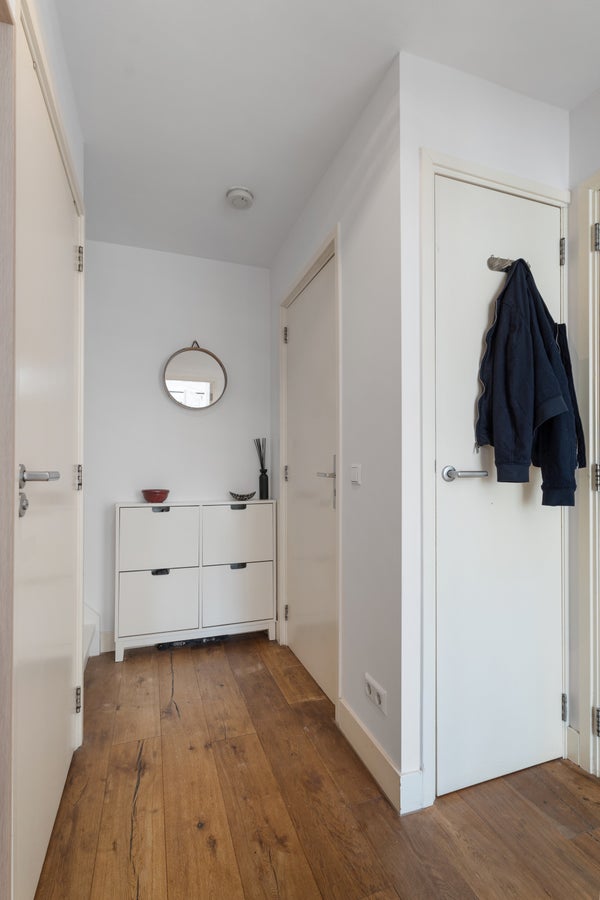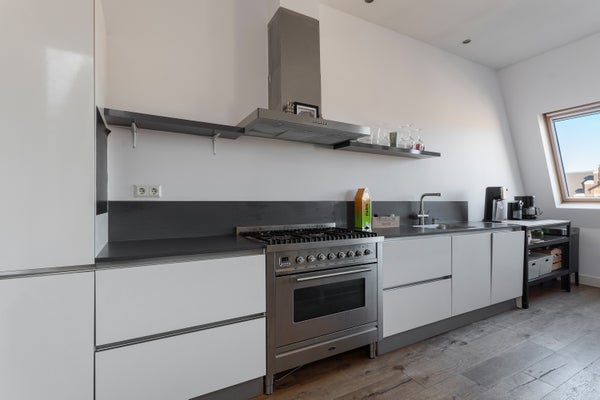 De entree geeft toegang tot de lichte woonkamer, die smaakvol is ingericht en voorzien van een mooie houten vloer. De ruime open keuken beschikt onder andere over een gasfornuis, oven, koel-vriescombinatie en voldoende bergruimte.