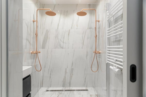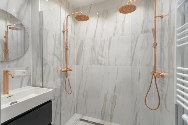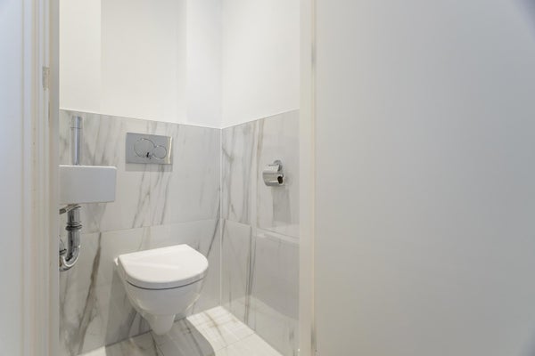 De badkamer is uitgevoerd in marmer en biedt pure hotel-luxe: een dubbele regendouche, een stijlvolle wastafel met meubel en een handdoekenradiator. Daarnaast is er een aparte wc met een wastafel.