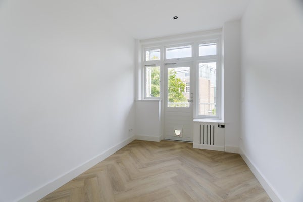 Aan de rustige achterzijde liggen twee ruime slaapkamers, beide met directe toegang tot het balkon dat zich uitstrekt over de volle breedte van het pand. Hier geniet je van de middag- en avondzon, met uitzicht op de groene binnentuinen.
