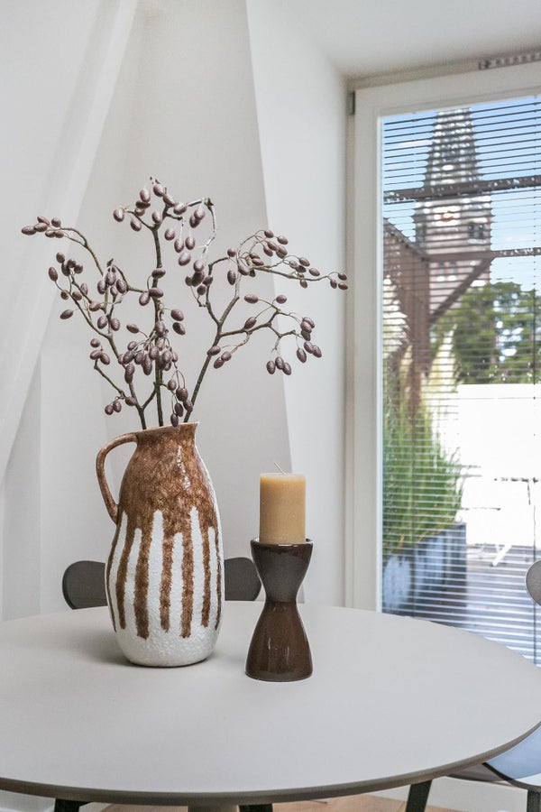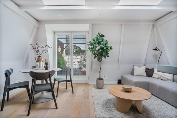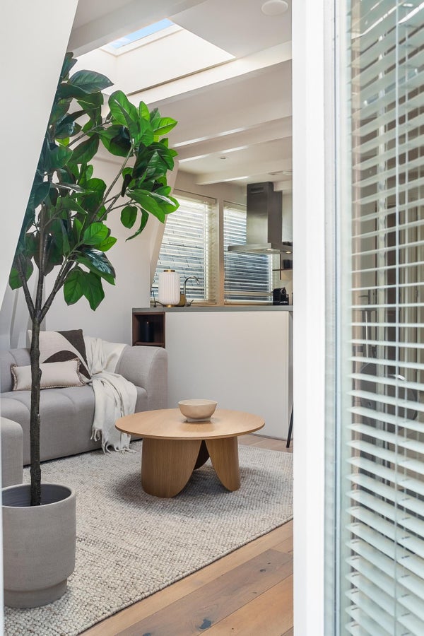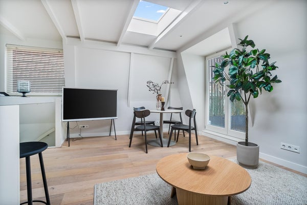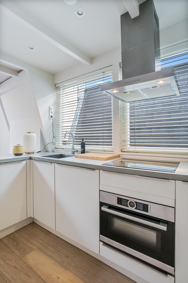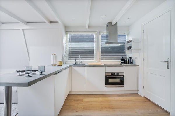De lichte woonkamer, met dakramen en is smaakvol ingericht met splinternieuwe meubels. Vanuit de woonkamer stap je direct het dakterras van circa 18m² op, een heerlijke plek om van de zon te genieten. De open keuken, uitgerust met een bar-element, is van alle gemakken voorzien en beschikt over moderne inbouwapparatuur.