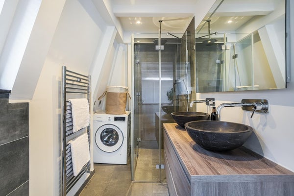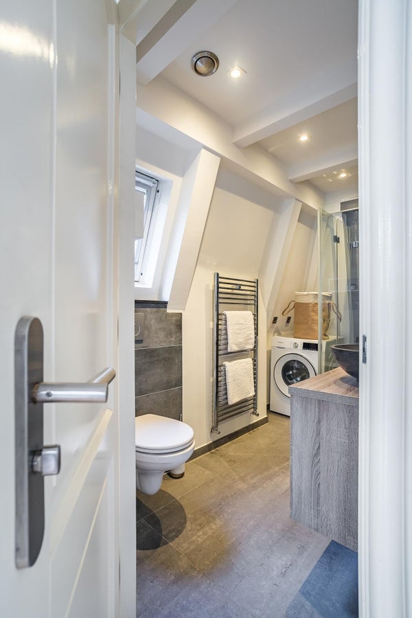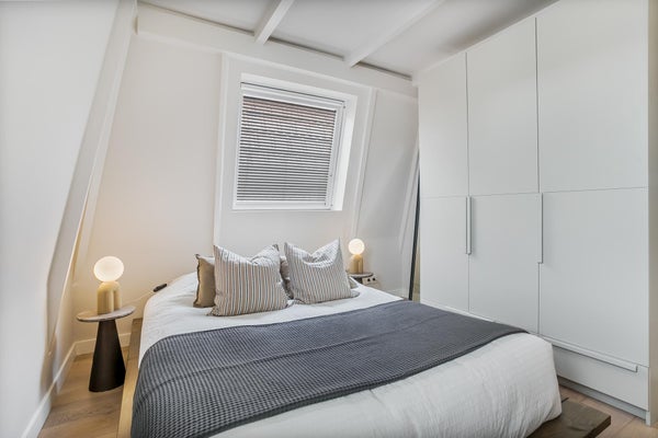De slaapkamer biedt een comfortabel tweepersoonsbed en heeft een royale kastenwand voor voldoende opbergruimte. De aangrenzende badkamer is modern ingericht met een inloopdouche, dubbele wastafel, wc en een handige was-/droogcombinatie.