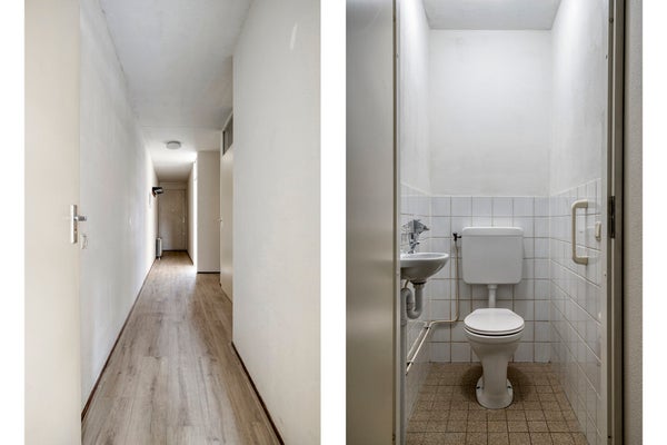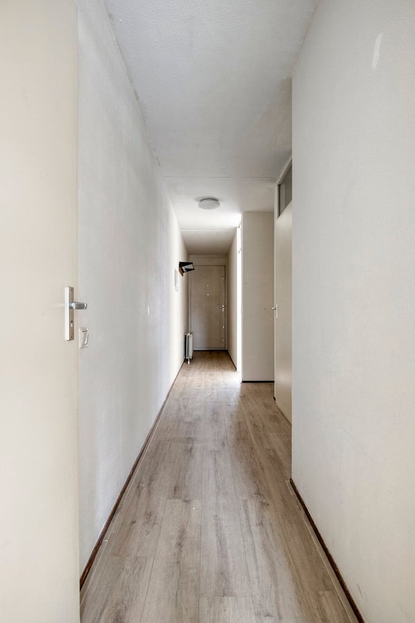 Via het gemeenschappelijke trappenhuis bereik je de galerij waar de voordeur van het appartement zich bevindt. Bij binnenkomst stap je in een nette, lange hal die toegang geeft tot alle vertrekken. De hal biedt voldoende ruimte voor een garderobe of schoenenkast.