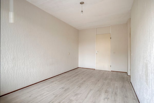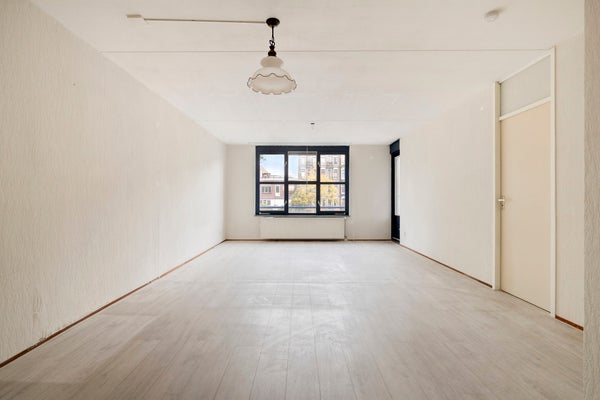 De ruime woonkamer is langgerekt en licht, met grote ramen aan de voorzijde die zorgen voor veel natuurlijke lichtinval en uitzicht op de rustige straat. De strakke lichte vloer en witte muren geven de ruimte een frisse, moderne uitstraling en maken het eenvoudig om de kamer naar eigen smaak in te richten. Er is voldoende plek voor een comfortabele zithoek én een eethoek.