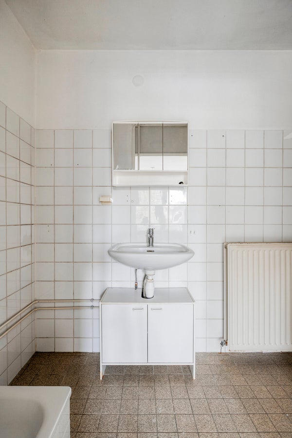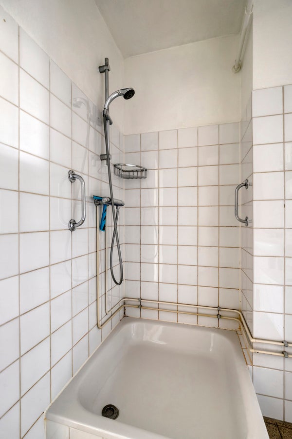 De badkamer is compact maar functioneel, voorzien van een douchehoek, wastafel en spiegelkast. De afwerking is neutraal met witte wandtegels.