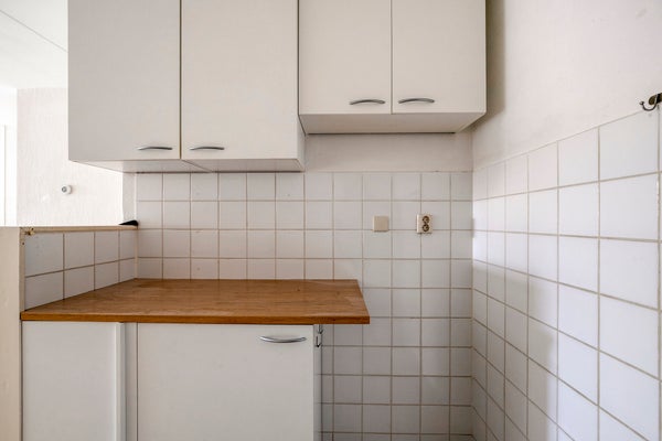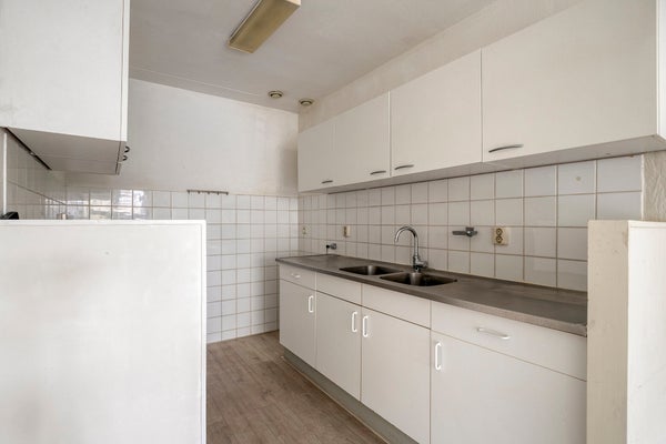 De keuken is praktisch ingericht en voorzien van een dubbele spoelbak, werkblad, boven- en onderkasten en de benodigde aansluitingen voor apparatuur. De lichte tegels en eenvoudige afwerking bieden een nette basis die naar wens kan worden gemoderniseerd. De keuken grenst direct aan de woonkamer, waardoor er een open gevoel ontstaat.