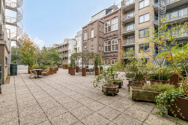 Aan de achterzijde is een balkon aanwezig dat uitkijkt over de binnentuinen. Een fijne plek om even buiten te zitten of planten neer te zetten.