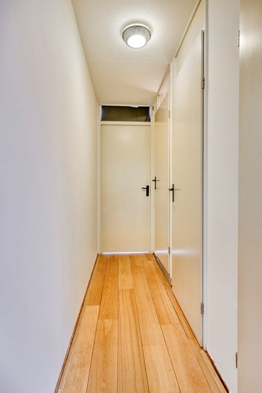 Entree via het gemeenschappelijke trappenhuis naar de derde verdieping. De hal geeft toegang tot de keuken en woonruimte. Vanuit de woonkamer bereikt u de eerste slaapkamer, die tevens toegang biedt tot het balkon. Naast de woonkamer leidt een gang naar het toilet, een wasruimte met wasmachine en droger, de badkamer, en uiteindelijk de tweede slaapkamer.