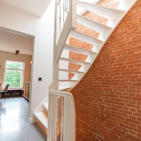 Bij binnenkomst in het appartement merkt u onmiddellijk de originele bruine stenen muren op langs de trap, die naadloos zijn geïntegreerd in het ontwerp van het appartement.