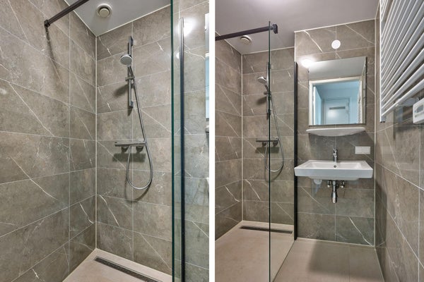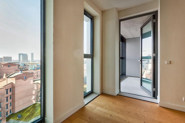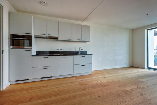 Op de 11e verdieping vindt u dit ruime appartement met een waanzinnig uitzicht. U komt binnen in de ruime hal met de meterkast, kast met stadsverwarming en de kast met het mechanische ventilatiesysteem. De hal geeft toegang tot het hangend toilet met fonteintje en de badkamer met wastafel en douche. De woonkamer heeft een open keuken. Door de vele ramen is het een licht appartement met een waanzinnig uitzicht. Via de woonkamer kom je op de loggia. De keuken is voorzien van inbouwapparatuur zoals een combimagnetron, koeler, inductiekookplaat, afzuigkap en vaatwasser. Naast de keuken heb je toegang tot een berging met de aansluiting voor een wasmachine. De ruime slaapkamer heeft ook een grote raampartij. De gehele woning is voorzien van vloerverwarming.