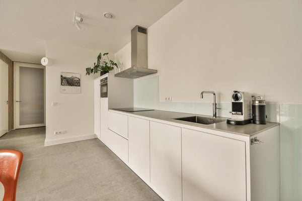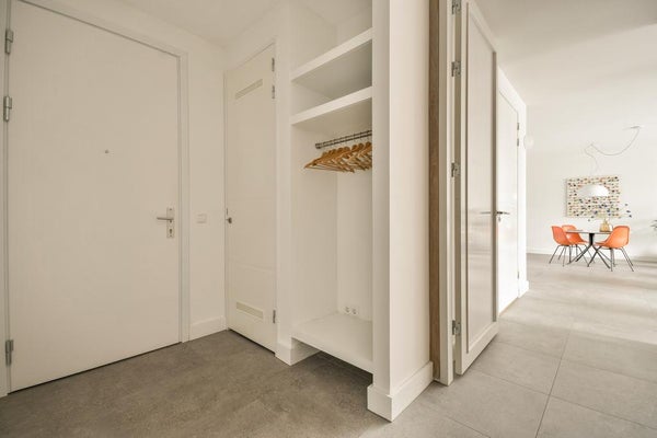 Entree in het luxueuze complex, met lift die toegang biedt tot het appartement welke gelegen is op de tweede verdieping. De ruime en lichte woonkamer beschikt over een moderne open keuken, welke van alle gemakken is voorzien. Denk hierbij aan een ingebouwde koel- en vrieskast, vaatwasser, oven, inductieplaat en afzuigkap.