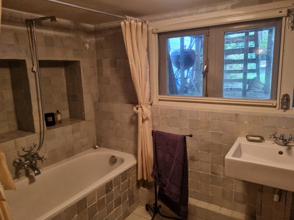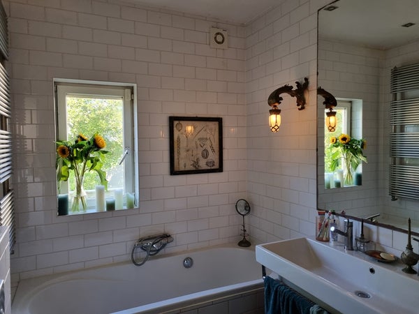 • Prachtige ensuite badkamer met een raam met uitzicht op de tuin, groot bad, inloopdouche en karakteristieke wastafel