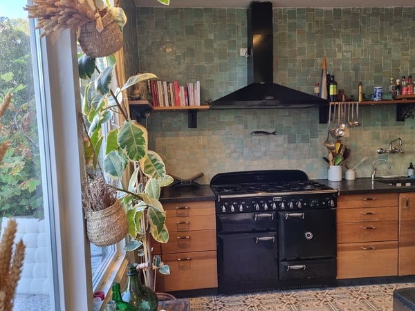 De keuken is een droom voor kookliefhebbers – met een Falcon fornuis, marmeren werkbladen, maatwerk kasten, open planken en high-spec apparaten, waaronder een grote Amerikaanse koelkast/vriezer. Stijlvolle tegels en houten afwerkingen creëren een warme, ambachtelijke sfeer. Vanuit de achterste zithoek openen elegante deuren naar een privéterras met uitzicht op de tuin, wat een rustige achtergrond creëert.