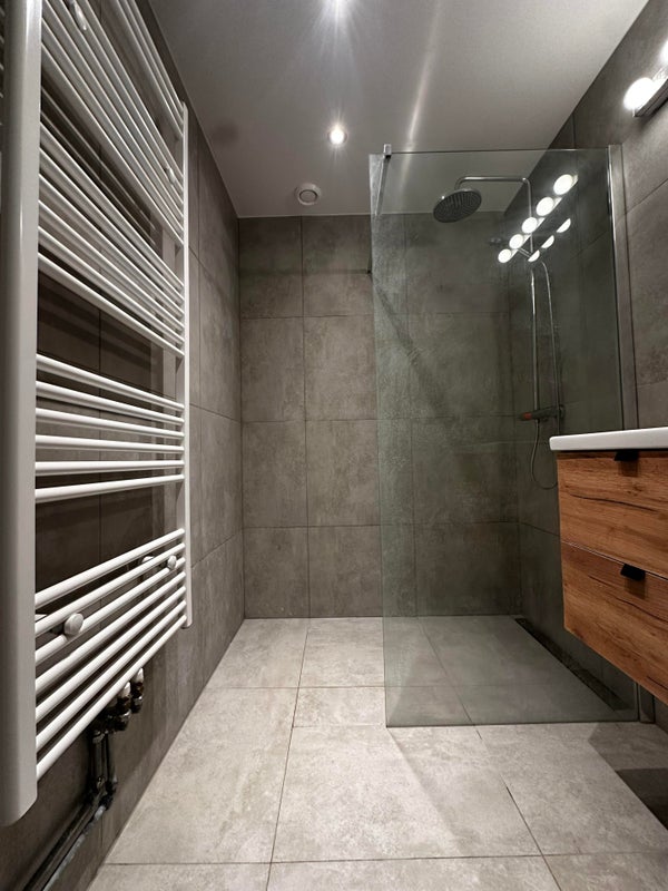 De recent gerenoveerde badkamer is uitgerust met moderne voorzieningen zoals een dubbele stopcontact, vloerverwarming, een handdoekradiator, een inloopdouche, een wastafel met bijbehorende meubelstukken. Deze combinatie maakt het een stijlvolle en rustgevende plek om uw dag te beginnen en te eindigen.