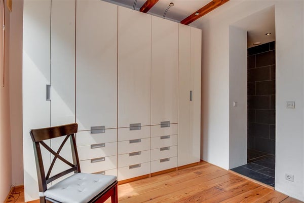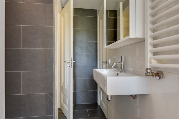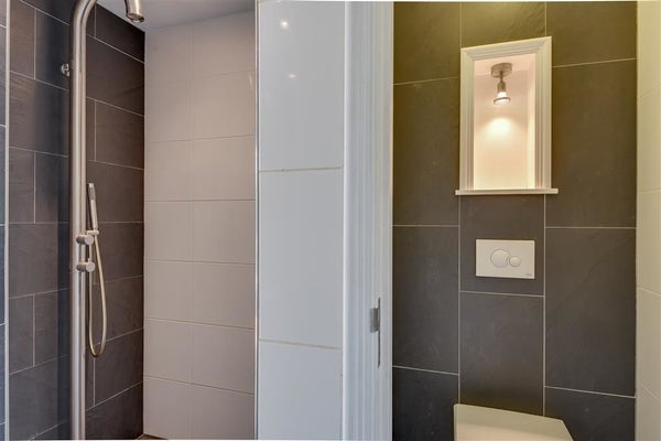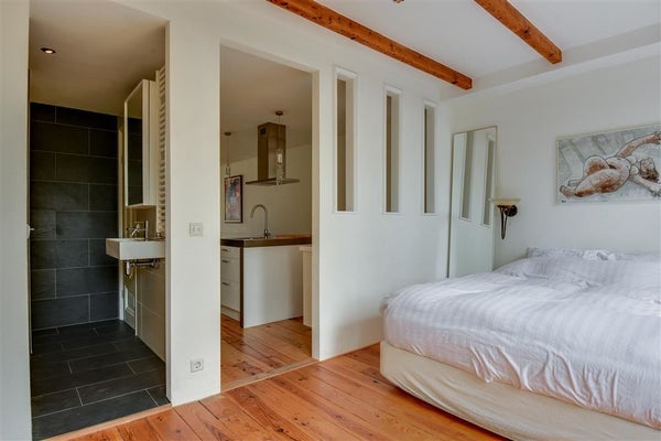 Het appartement beschikt over een ruime slaapkamer. Deze ruimte ligt op het zuiden, aan de tuinkant met een aangrenzende inloopbadkamer. De moderne badkamer is in goede staat, voorzien van een apart toilet, wastafel met fontein, ruime douche en vloerverwarming.