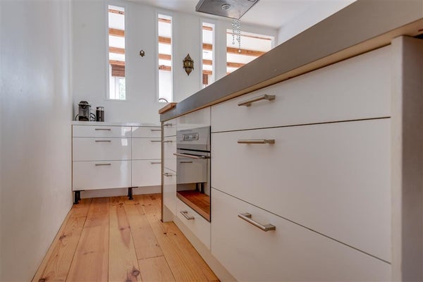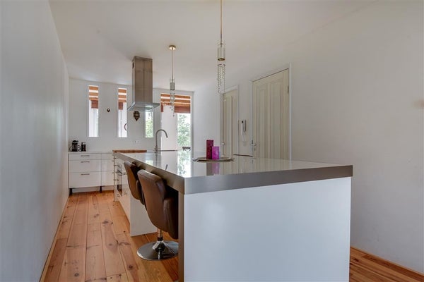 De ruime lichte woonkamer heeft een houten vloer, die direct sfeer in de ruimte brengt. Tussen de woonkamer en de keuken, tref je een afgesloten bijkeuken met de was- en droogmachineaansluiting en een Intergas HR CV ketel.