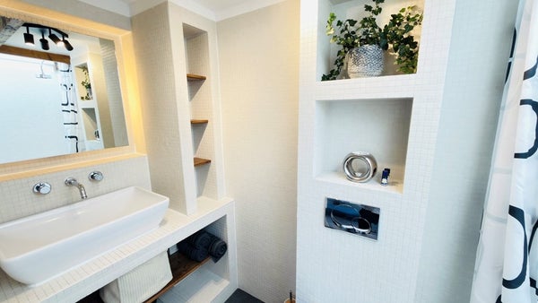 Via een deur vanuit de woonkamer is er een extra ruimte die wordt gebruikt als wasruimte, garderobe en waar de verwarmingsinstallatie zich bevindt.