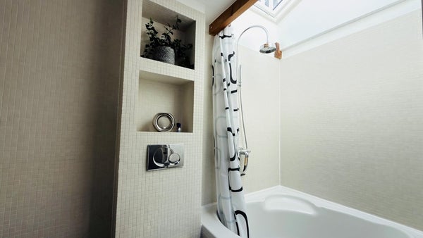 De romantische slaapkamer bevindt zich op de bovenste verdieping met de zichtbare balkenstructuur en is bereikbaar via een interne open trap. De comfortabele badkamer is en-suite en biedt een hoekbad dat ook als douche wordt gebruikt, een groot wastafel toilet en voldoende planken.