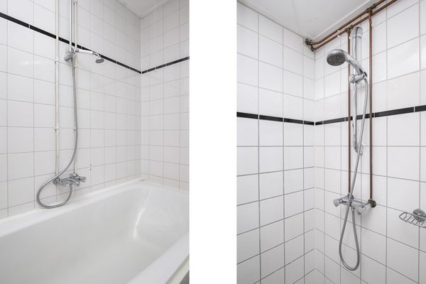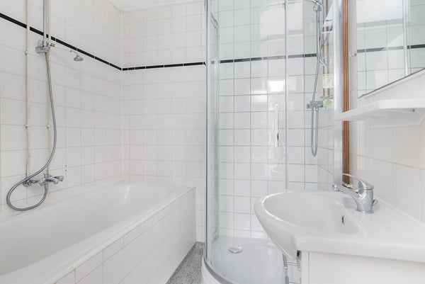 Badkamer met bad, douche en wastafel