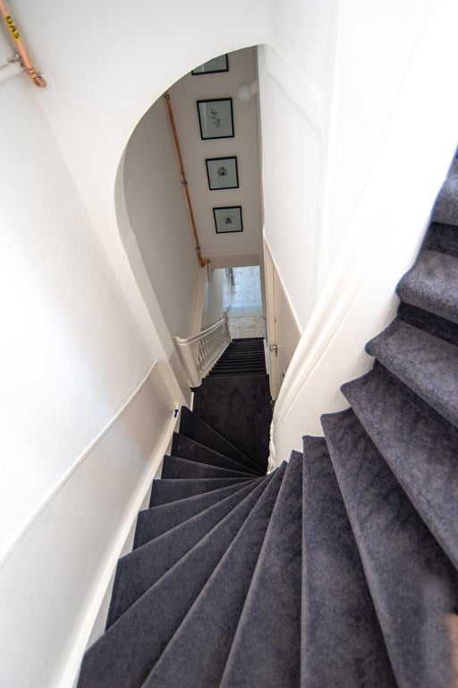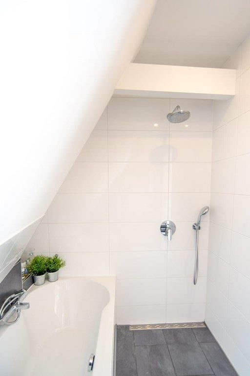 Entree, op de 3e verdieping. De mooie en moderne open woonkamer heeft een prachtig uitzicht op de gracht. Eetgedeelte en open keuken met moderne apparatuur. Trap naar de bovenste verdieping. Op deze verdieping vind je de slaapkamer, moderne badkamer uitgerust met een badkuip, aparte inloopdouche en wastafel. Er is ook toegang tot het op het zuiden gerichte dakterras waar je kunt ontspannen na een zware dag werken. De wasmachine en droger bevinden zich op de tweede verdieping.