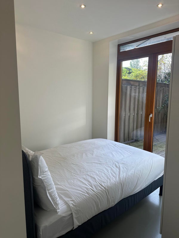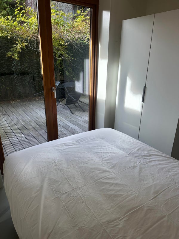 Aan de achterzijde van het appartement bevindt zich de tweede slaapkamer, eveneens voorzien van een 2 persoons bed en een aparte kledingkast. Deze slaapkamer heeft toegang tot de zonnige patio/tuin.