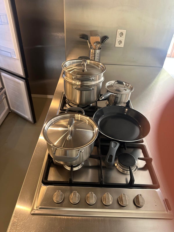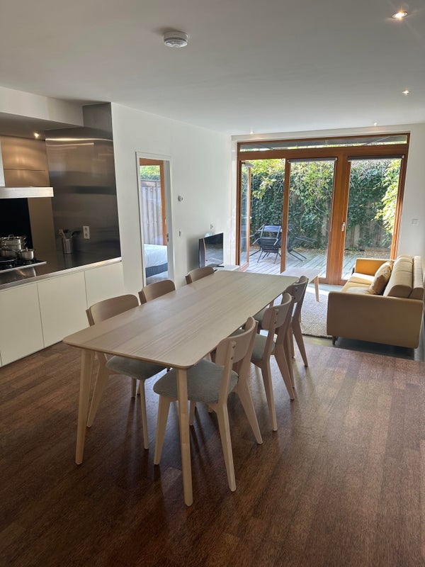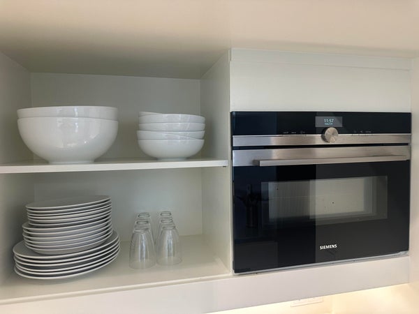 De open keuken is zeer functioneel ingericht en uitgerust met moderne apparatuur, waaronder een kookeiland, koel-vriescombinatie, combimagnetron en vaatwasser. Ook is het kook- en eetgerei aanwezig. Naast het kookeiland staat een nieuwe eettafel met 6 stoelen.