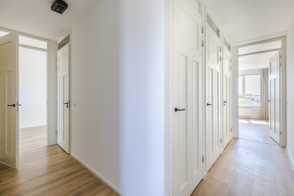 Entree in hal met meterkast, bergkast met daarin de opstelling van de recente C.V.-combiketel alsmede, een separaat toilet met fontein en een aparte wasmachine berging. De hal geeft middels loopdeuren toegang tot alle vertrekken van dit appartement, behalve de serre. De badkamer is centraal gesitueerd en betegeld in lichte contrast kleurstelling. De badkamer beschikt verder over een fraaie inloopdouche met glazen wanden, een net wastafelmeubel met lades en een grote spiegel met verlichting. De woonkamer is gelegen aan de achterzijde van de woning en beschikt over een grote raampartij. Door deze raampartij heeft men hier een fraai uitzicht en veel natuurlijk lichtinval. Vanuit de woonkamer komt men tevens in de serre welke ca. 7m2 meet. De serre is middels het openzetten van het glazen harmonicaraam c.q. de glazen pui te veranderen in een prettige loggia. De moderne open keuken is in contrast kleurstelling uitgevoerd en in L-opstelling geplaatst met een losstaand extra snijblok. Daarnaast beschikt de keuken o.a. over een kookplaat, een afzuig/wasemkap, combimagnetron, een koelkast met vriesvak, een vaatwasser, een spoelbak en voldoende kastruimte.