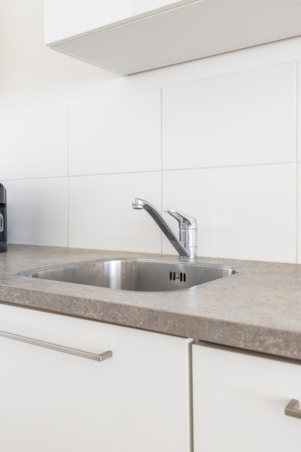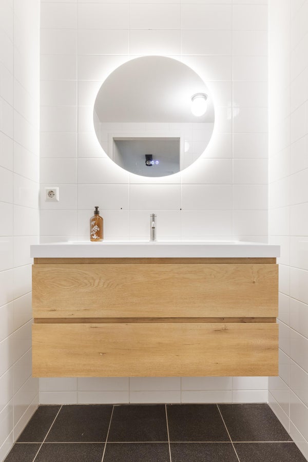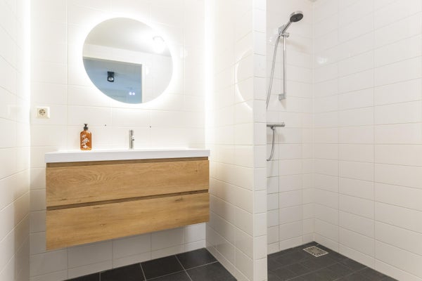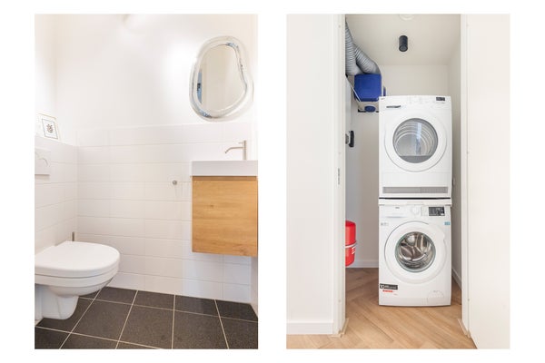 De badkamer is voorzien van een wastafelmeubel met spiegel en er is een separaat toilet aanwezig. Daarnaast beschikt de woning over een aparte ruimte met aansluiting voor wasmachine en droger. Dit maakt het appartement niet alleen verzorgd, maar ook praktisch in gebruik.