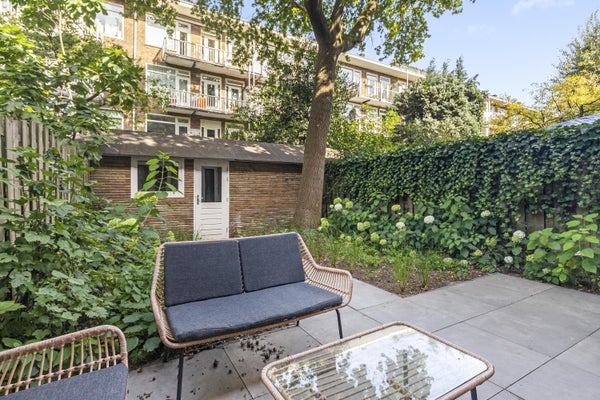 De achtertuin biedt volop mogelijkheden om buiten te genieten. Het betegelde terras grenst direct aan de woning en achterin bevindt zich een stenen berging die zeer geschikt is voor fietsen of extra opslag. De tuin is verzorgd aangelegd en biedt een prettige mate van privacy.