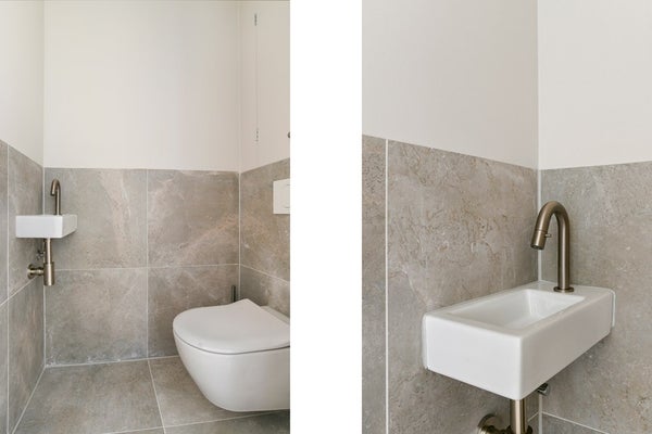 The bathroom is equipped with a walk in show a desiger, design radiator and double sink. In the hallway you find the separate toilet and a closet with the washing machine and some storage space.