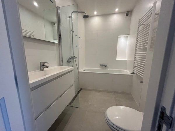 De badkamer heeft een aparte, douche, bad, wastafel en toilet.