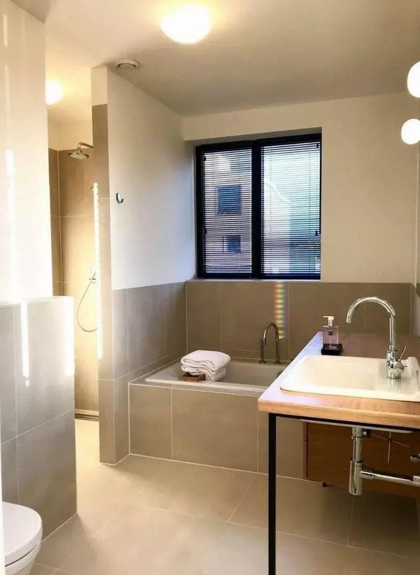 Daarnaast is er een apart toilet en een luxe badkamer met een tweede toilet, een dubbele wastafel en een strakke inloopdouche.