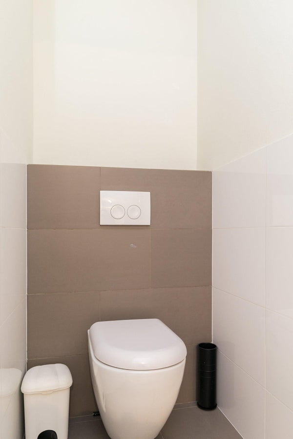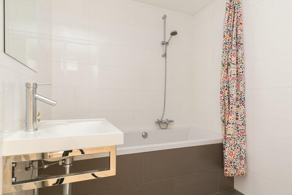 Badkamer met bad/douche, wasbak, kast. Separate toiletruimte met wasbak.
