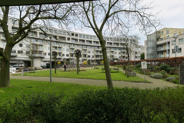 Omgeven door water, speelplaats voor kinderen. Op loopafstand van een winkelgebied genaamd Brazilie met allerlei winkels zoals supermarkt, boekhandel, Domino's pizza, enkele restaurants en lunchrooms.